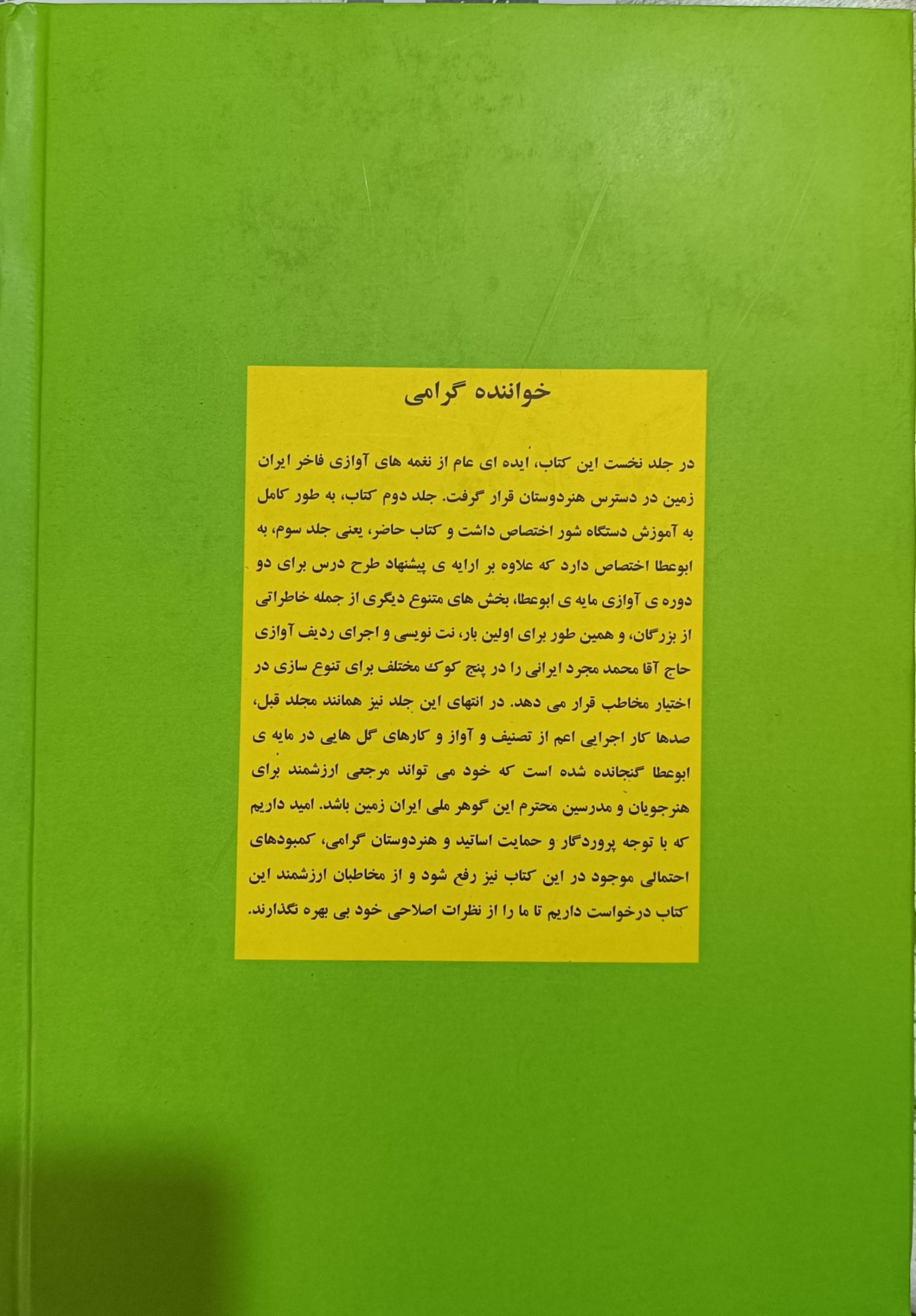 آموزش آواز اصیل ایرانی جلد سوم (آواز ابوعطا) مهدی کاظمی و مهدی قاسمی 0 نفر شناسه محصول: 1101091001003 دسته: آواز, کتاب, کتابها آماده ارسال بازگشت آماده ارسال این محصول موجود و آماده ارسال می باشد. 200,000 تومان 1 در انبار آموزش آواز اصیل ایرانی جلد سوم (آواز ابوعطا) مهدی کاظمی و مهدی قاسمی عدد افزودن به سبد خرید افزودن به علاقمندی اشتراک گذاری